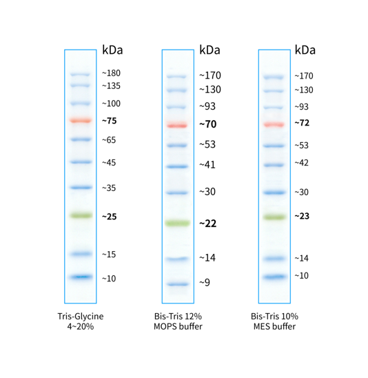 本產(chǎn)品由跨度從 10-180 kDa 的 10 種高度純化預(yù)染的重組蛋白質(zhì)組成,各條帶濃度約為 0.2-0.4 mg/ml。其中 25 kDa 條帶為綠色預(yù)染條帶,75 kDa 條帶為紅色預(yù)染條帶,方便判斷各個(gè)條帶的準(zhǔn)確位置。本產(chǎn)品適合作為 SDS-PAGE 電泳時(shí),變性蛋白樣品的分子量參照,并可實(shí)時(shí)觀察蛋白樣品的電泳分離狀況,也可用于檢測 Western blot 的轉(zhuǎn)膜效率。由于共價(jià)結(jié)合的染料會影響蛋白質(zhì)分子的電泳遷移率,本產(chǎn)品僅適于粗略地估計(jì)目的蛋白樣品的分子量。