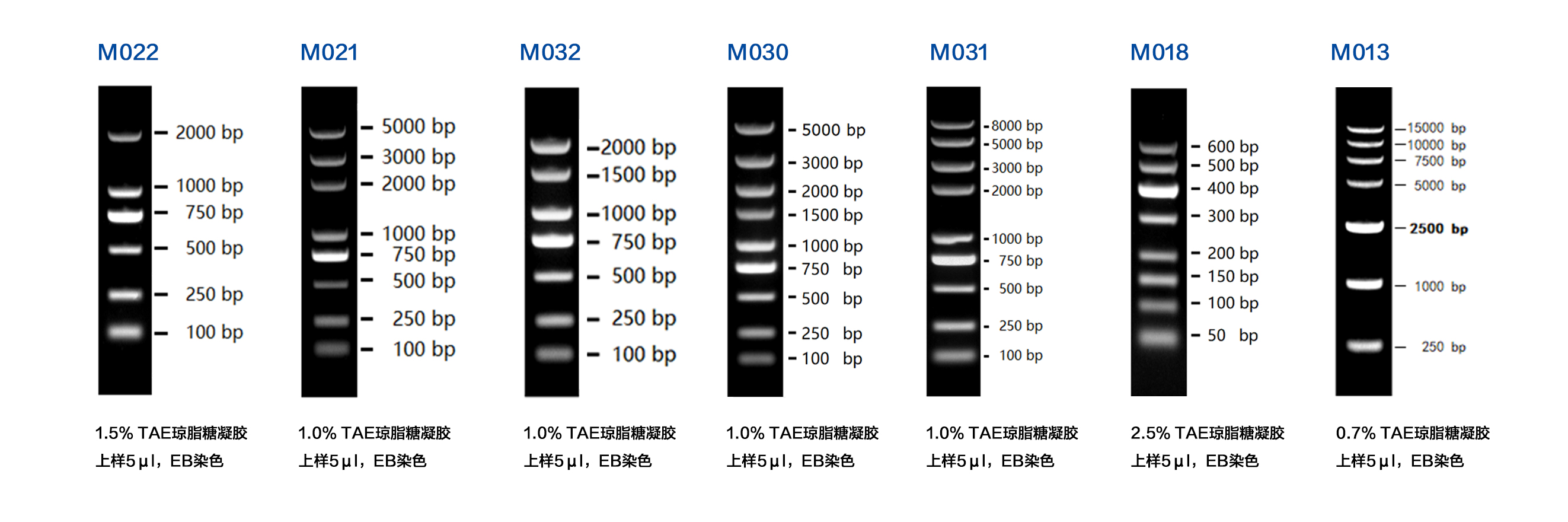 本產(chǎn)品為預混有 1× 上樣緩沖液的即用型 DNA 分子量標準,由 7 條線狀雙鏈 DNA 條帶組成,適用于對 250-15000 bp 的雙鏈 DNA 分子大小的估算和粗略定量。本產(chǎn)品的 7 條帶分別為 250、1000、2500、5000、7500、10000 和 15000 bp。其中 2500 bp 條帶濃度最大,為 20 ng/µl,其余條帶濃度約為 10 ng/µl。