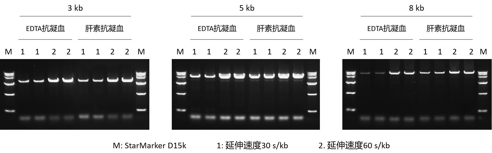 以抗凝劑為 EDTA 的人抗凝血為模板,使用 A161 對(duì)不同長度 DNA 片段進(jìn)行 PCR 擴(kuò)增。電泳檢測結(jié)果顯示,A161 對(duì)不同大小的片段擴(kuò)增能力均較強(qiáng),可以高效擴(kuò)增長達(dá) 8 kb 的片段。