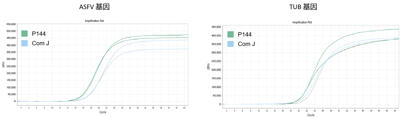 以 50 mg 含有非瘟病毒(ASFV)的豬肉組織為樣品,使用 GenStar #P144 和 Com J,室溫孵育 5 min 后進行核酸提取,提取后進行 qPCR 檢測。結果顯示,P144 提取效率高,且優(yōu)于 Com J。