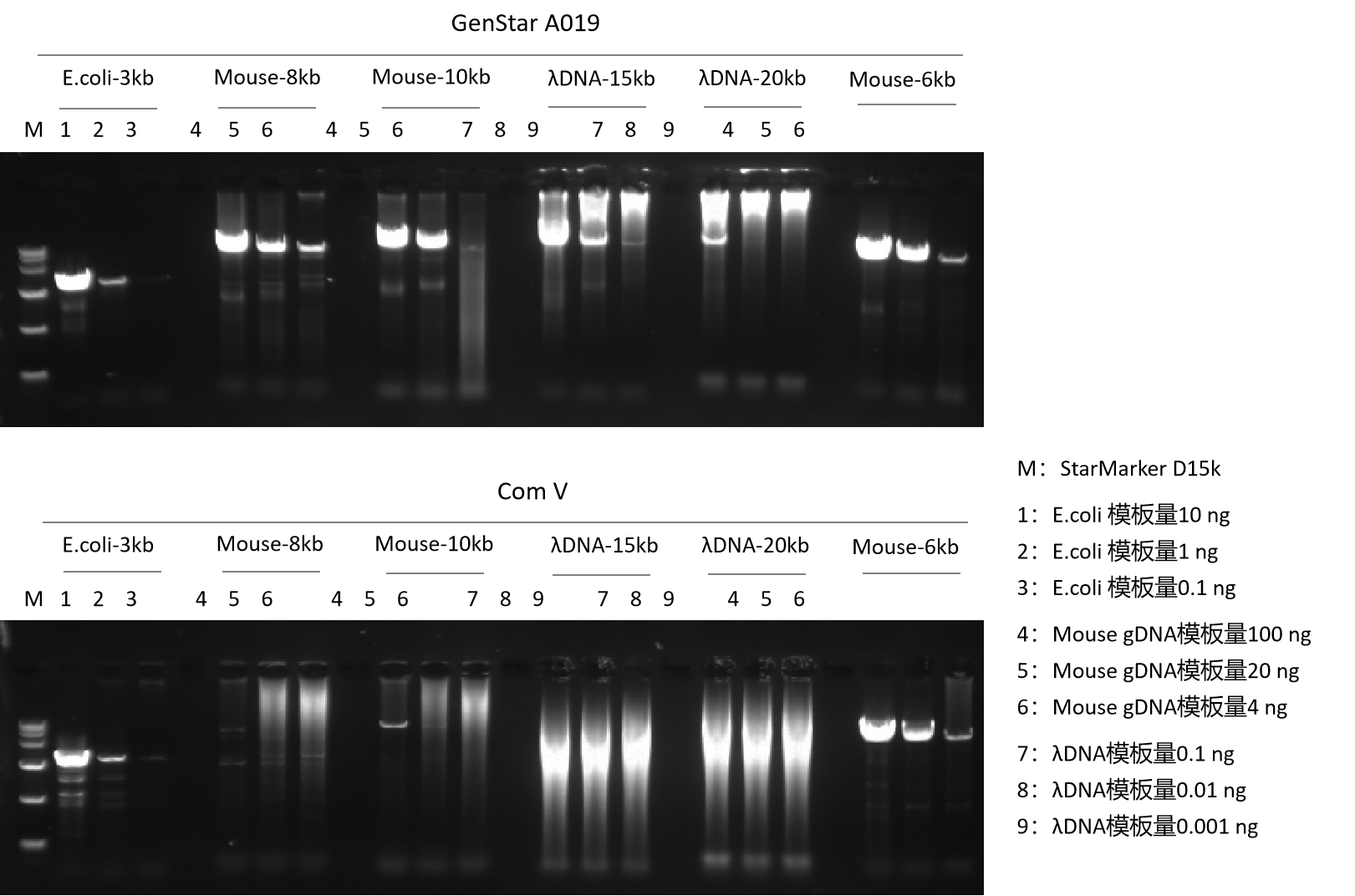 以 E.coli gDNA、Mouse gDNA、λDNA 為模板,使用 A019 和 Com V 進行不同長度片段的擴增。結果顯示,A019 對不同種屬來源的長片段擴增能力強,且優于 Com V