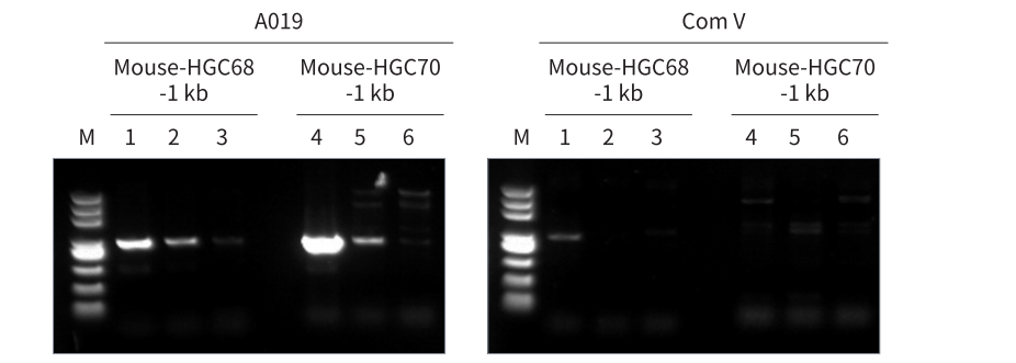 以 Mouse gDNA 為模板,使用 A019 和 Com V 進行高 GC 片段的擴增。結果顯示,A019 對高 GC 片段的擴增能力強,且優于 Com V
