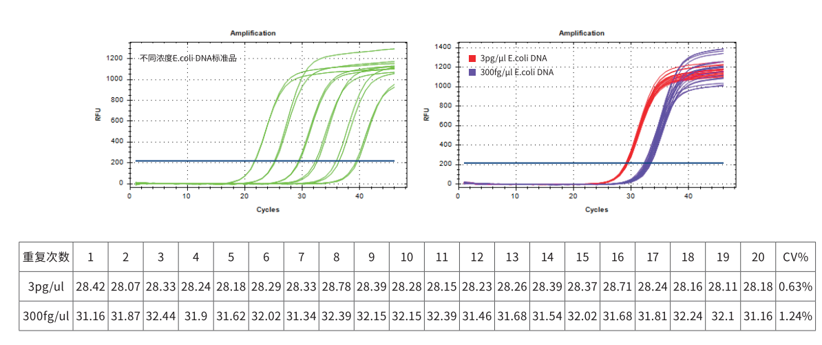 重復 20 次檢測 3 pg/μl 和 300 fg/μl 的 E.coli DNA,CT 值 CV<5%,結(jié)果顯示 GenStar #A801 重復性好。