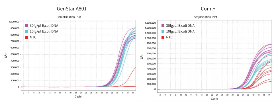 GenStar #A801 與 Com H 對 30 fg/μl、10 fg/μl E.coli DNA 擴增效果均良好。8 個 NTC 中,Com H 全部起峰,GenStar #A801 只有一個起峰,因此 GenStar #A801 檢測結(jié)果更準確。