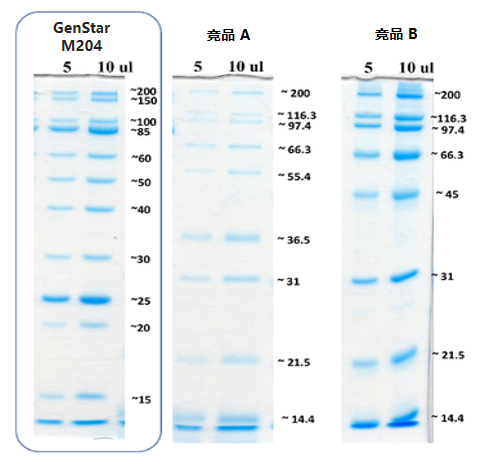 本產(chǎn)品包含了 12 種未染色重組蛋白的混合物,預先用上樣緩沖液稀釋,用于 SDS-PAGE 電泳。通過 SDS-PAGE 電泳并經(jīng)考馬斯亮藍染色后,在 10-200 kDa 范圍內(nèi)會形成 12 條明亮清晰的條帶。12 種條帶分別為:10、15、20、25、30、40、50、60、85、100、150、200 kDa,其中增強的蛋白條帶為 25 kDa 和 85 kDa。本產(chǎn)品為非預染型蛋白分子量標準,可準確的反映目的蛋白樣品的分子量。