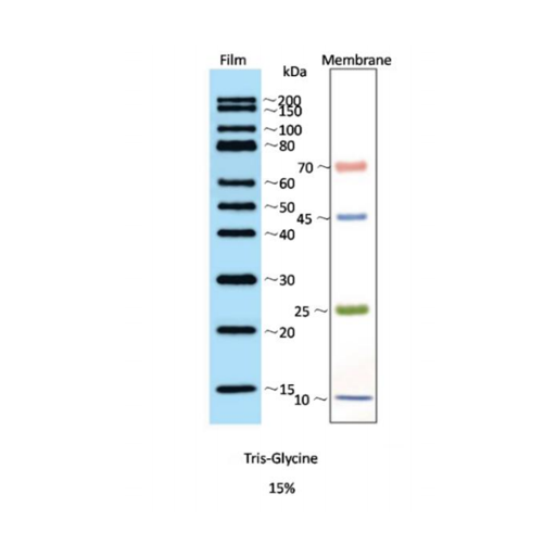 本產品由跨度從 10-200 kDa 的 14 種純化的天然蛋白混合而成。其中 25 kDa 條帶為綠色預染條帶、10 kDa 和 45 kDa 條帶為藍色預染條帶、70 kDa 條帶為粉色預染條帶,便于動態(tài)觀察電泳狀態(tài),方便判斷各個條帶的準確位置和轉膜效果。其他 10 條條帶含有多種 IgG 亞型結合位點,可以和目的蛋白條帶同時結合抗體,用相同抗體來檢測,經化學發(fā)光檢測或者通過 CCD 成像后顯示 15 kDa、20 kDa、30 kDa、40 kDa、50 kDa、60 kDa、80 kDa、100 kDa、150 kDa、200 kDa 條帶。