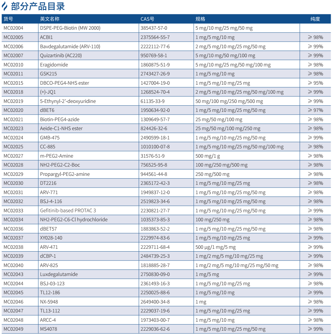 在患者體內(nèi),PROTAC 的靶蛋白配體和靶蛋白結(jié)合,E3 泛素連接酶配體和細胞內(nèi)的 E3 泛素連接酶的底物結(jié)合區(qū)結(jié)合,從而通過 Linker 把靶蛋白“拉近”到 E3 泛素連接酶旁邊,實現(xiàn) UPS 系統(tǒng)將靶蛋白降解。GenStar目前可提供多種 PROTAC 相關(guān)分子產(chǎn)品,包含:PROTACS、PROTACLinker、Ligands for E3 Ligase.Ligands for Target Protein for PROTAC、 Molecular Glues、ATTECs、E3 Ligase Ligand-LinkerConjugates 等。
