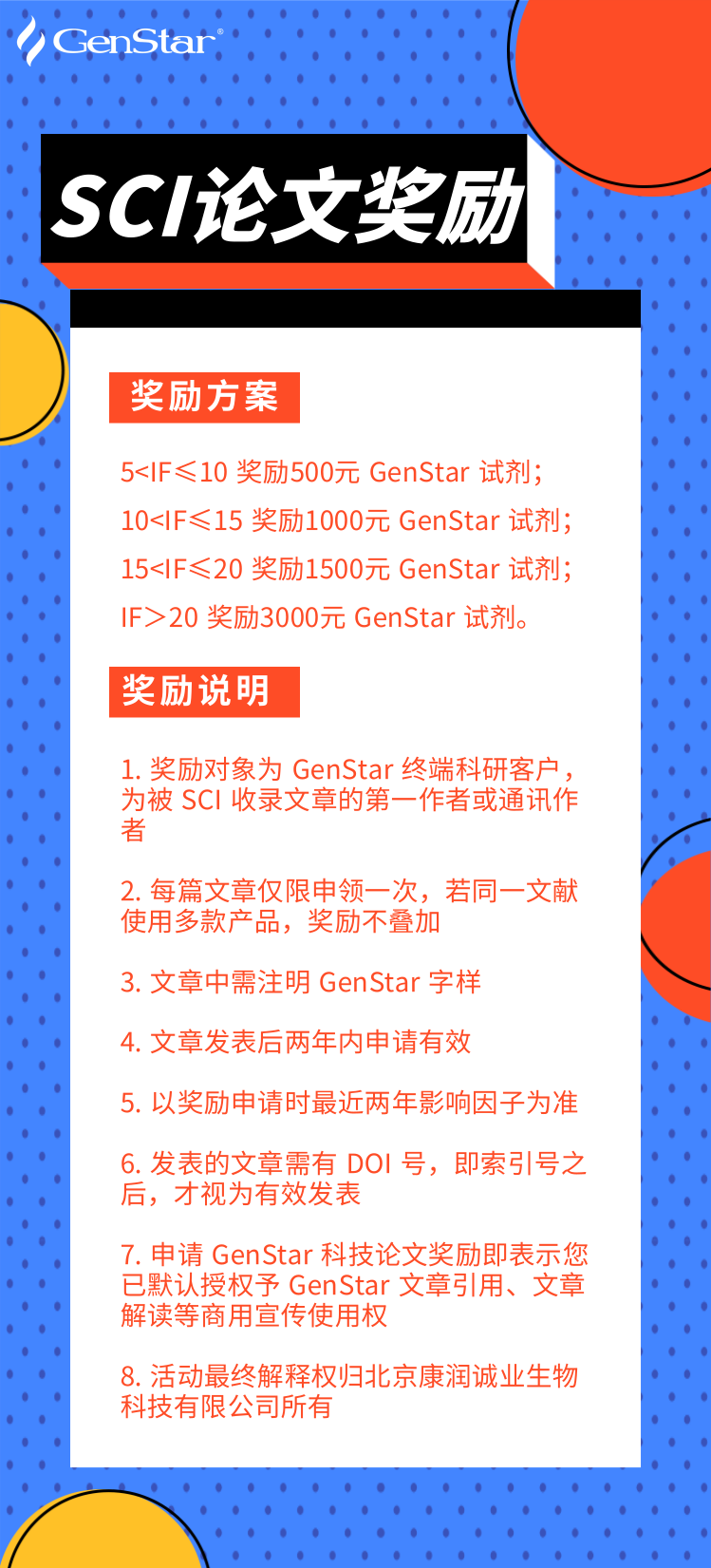 GenStar 自成立以來,一直深耕于分子生物學(xué)領(lǐng)域上游核心原料及配套體系的研發(fā),服務(wù)了全國數(shù)千家實(shí)驗(yàn)室的科研人員。使用 GenStar 產(chǎn)品的 SCI 論文總數(shù)已達(dá)千余篇,其中包含《Nature》、《Science》、《Cell》等高水平的學(xué)術(shù)期刊。為了感謝廣大客戶的支持與信任,GenStar 繼續(xù)推行發(fā)表科技論文獎勵(lì)機(jī),使用 GenStar 產(chǎn)品發(fā)表科技論文的人員均可申請。希望更多新老客戶參與其中,期待和您一起分享成功的喜悅。