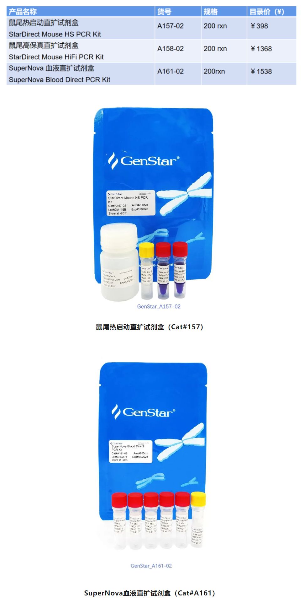 GenStar直擴(kuò)PCR系列為本次展會咨詢的明星產(chǎn)品,GenStar直擴(kuò)PCR系列產(chǎn)品包括鼠尾直擴(kuò)試劑盒和血液直擴(kuò)試劑盒。無需核酸提取,直接使用動物或植物組織等即可進(jìn)行PCR反應(yīng)。省去了核酸提取環(huán)節(jié),不僅能節(jié)省時(shí)間,又能節(jié)省成本,為核酸擴(kuò)增和檢測帶來前所未有的便捷。