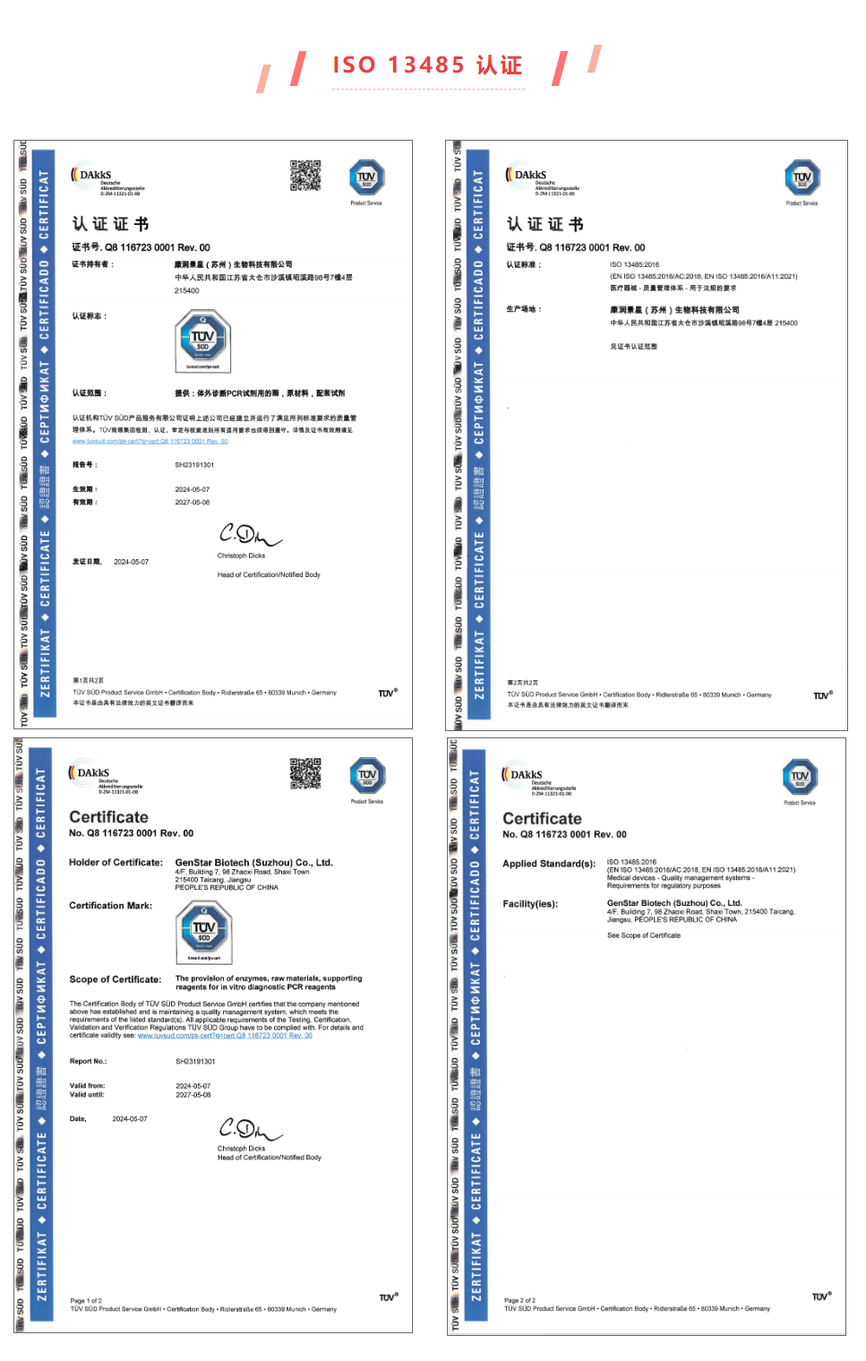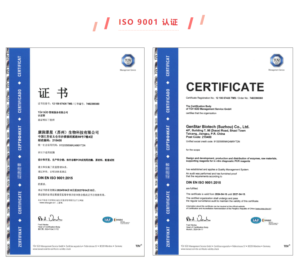 近日,康潤景星(蘇州)生物科技有限公司(GenStar全資子公司)經(jīng)國際第三方檢測認(rèn)證機(jī)構(gòu)TÜV南德意志集團(tuán)(以下簡稱“TÜV南德”)的嚴(yán)格審查,再次通過ISO9001:2015質(zhì)量管理體系和ISO13485:2016醫(yī)療器械質(zhì)量管理體系認(rèn)證審核,并獲得證書。