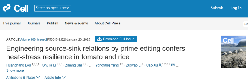 1. Huanchang Lou,Shujia Li,Zihang Shi,et al. Engineering source-sink relations by prime editing confers heat-stress resilience in tomato and rice. Cell. 2025.Jan. IF=45.6