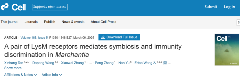 1. Xinhang Tan,Dapeng Wang,Xiaowei Zhang,et al. A pair of LysM receptors mediates symbiosis and immunity discrimination in Marchantia. Cell. 2025.Mar. IF=45.6